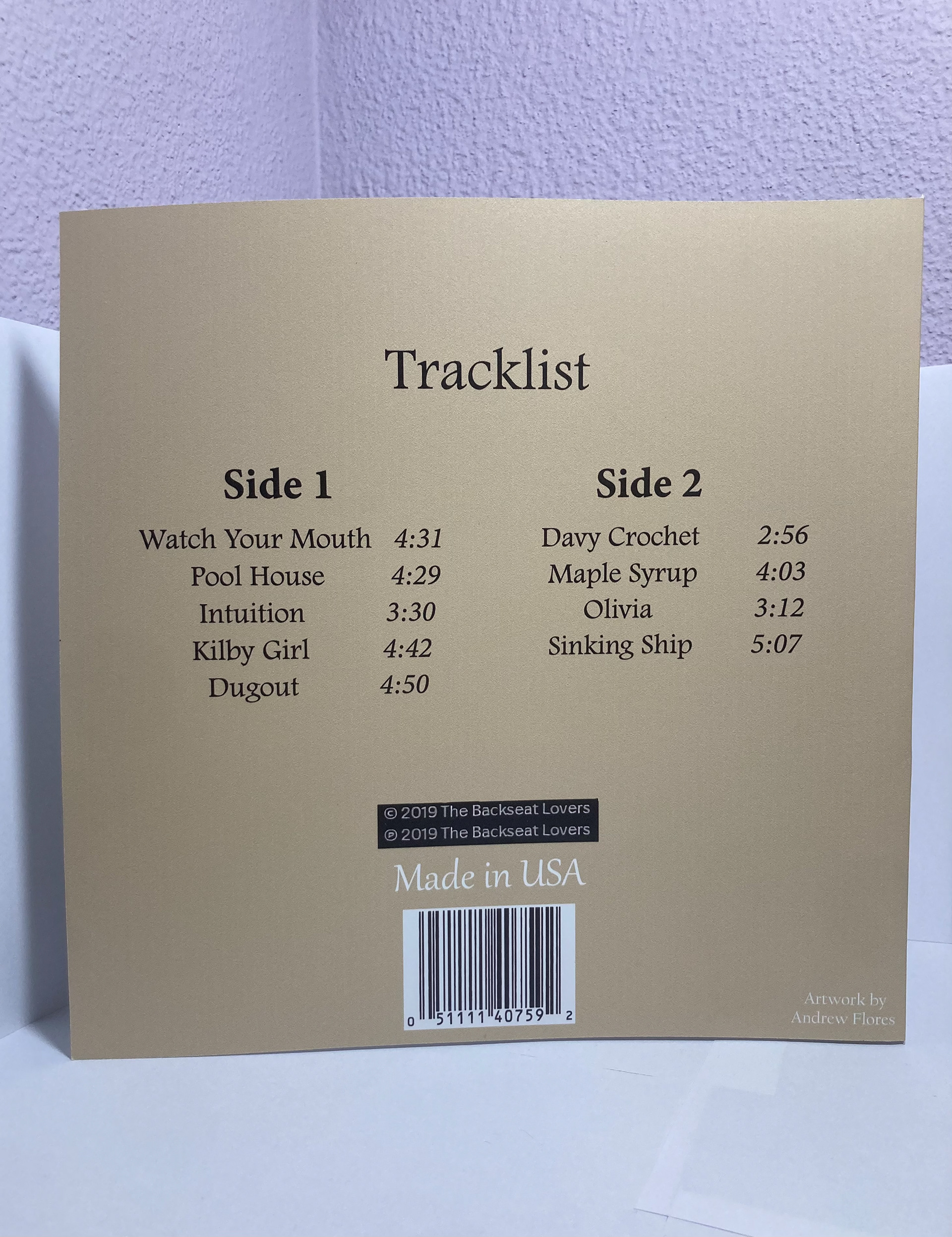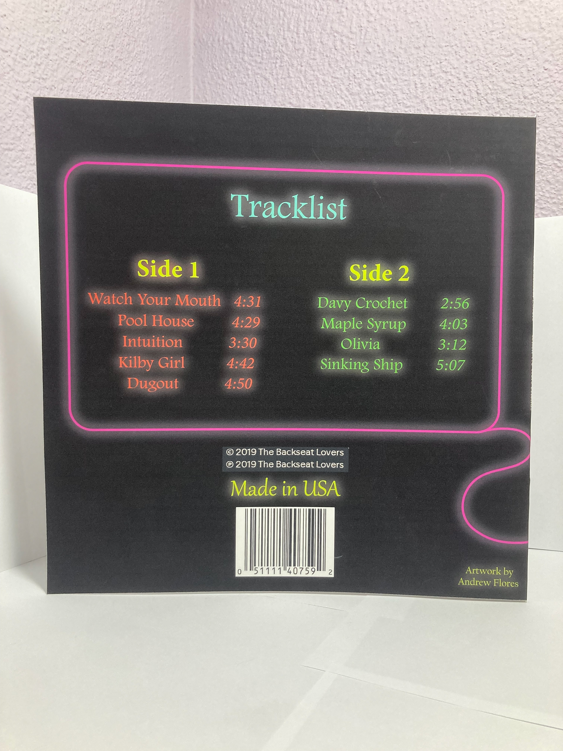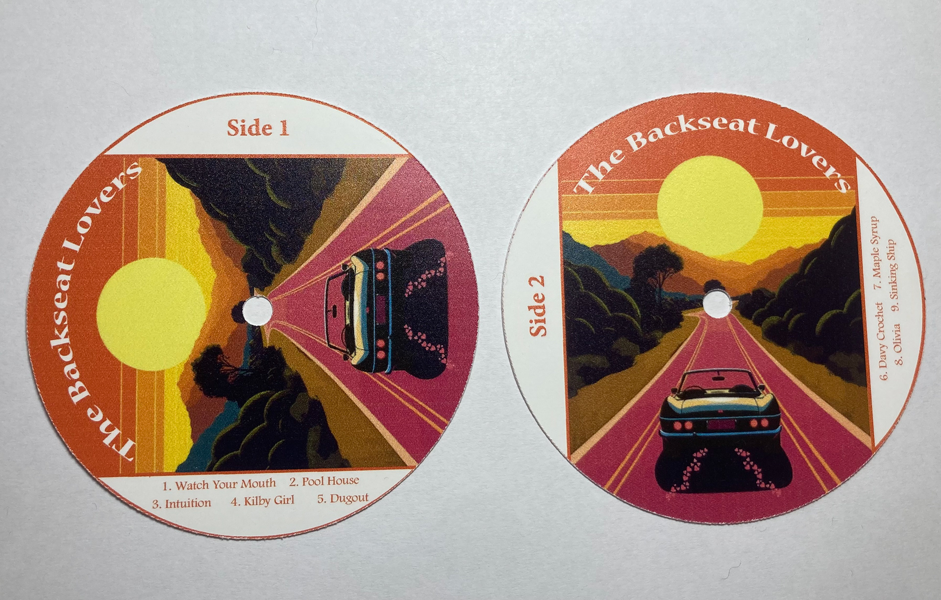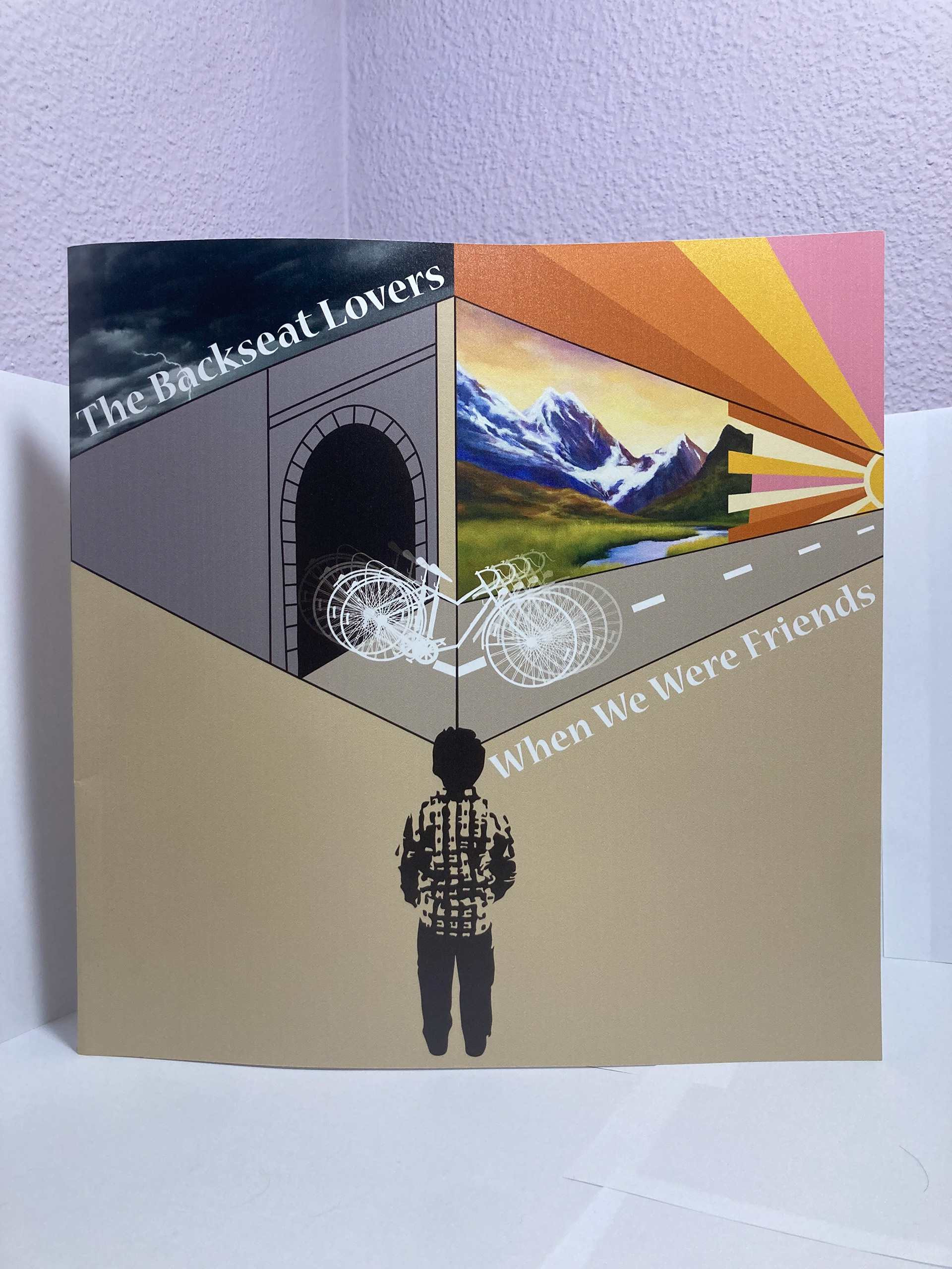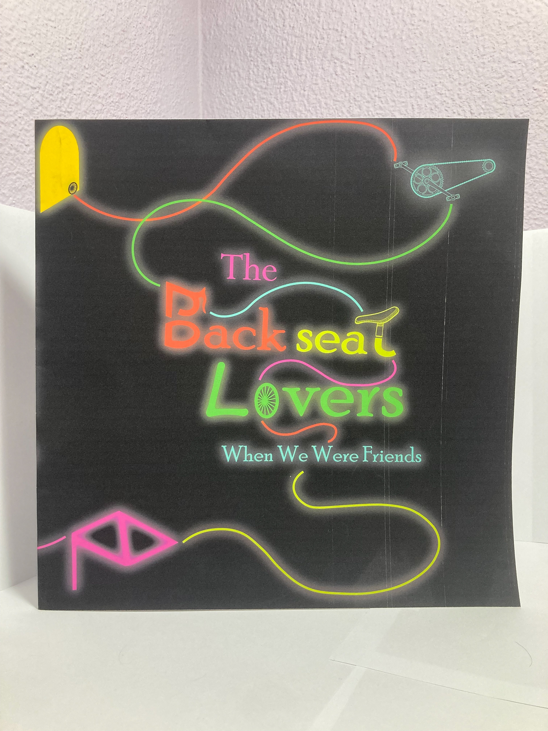 Tasked with basing a vinyl cover off an album cover of choice, I chose the debut album, "When We Were Friends", from one of my favorite artists, The Backseat Lovers. The bottom left picture illustrates that album cover, while the middle pair of photos represents my initial design, which keeps the elements of the tunnel and bicycle from the original cover. I utilized the image of a young boy staring at a dividing point with the bike leaving the dark tunnel and dark skies, and heading towards bright colors and beautiful scenery down the road. This symbolizes an important time in the boy's life where he must choose between two very different paths. The top two photos represent my final design, which once again keeps the element of the bike by scattering its parts throughout the cover, with some being used to spell the band's name. The neon color scheme comes from the idea of glow-in-the-dark lights being applied to light up the bike while it's traveling through the tunnel. In the top left of the front cover, you can see the light at the end of the tunnel, and one of the wheels rolling through it. The bottom right photo shows the center labels, which exhibit the band's name with a fitting image of a car driving into the sunset, leaving hearts trailing behind.
